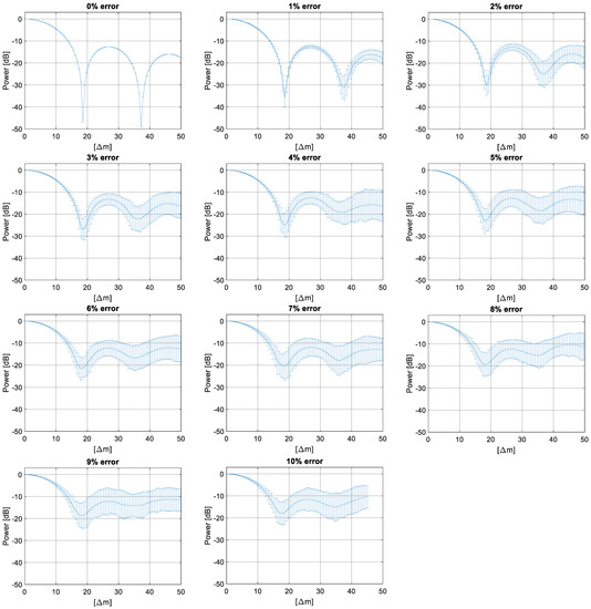 Figure 10 shows the nominal positions of the sensors together with the outcomes; each panel refers to a different perturbation strength. The corresponding vertical IRF is shown in Figure 11; the horizontal axis refers to the elevation whereas the vertical represents the attenuation in dB, the vertical bars refer to . It may be observed that driving away from the regular sampling leads to smaller rejection of the echoes coming from surrounding elevations and a larger uncertainty in the exact dB value.