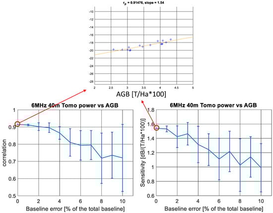 For each outcome of the sensors positions, the tomographic power coming from 40 m above the ground level was estimated and then put in relation with AGB. The choice of 40 m rather than 30 m [15] was driven by the need to take the ground level in correspondence of a zero of the vertical impulse response function (see Figure 11) as suggested in Reference [30]. Many scatterplots as shown by the top panel of Figure 12 were computed and for each one the linear fit estimated. The effectiveness of the tomographic power at being a good proxy for AGB has been assessed by evaluating the correlation coefficient and the sensitivity to AGB; this latter expressed in dB/(Mg/Ha·100) so that a high value suggests more robust estimations. The behavior of the correlation and the sensitivity varying the orbital irregularities is shown in the bottom panels of Figure 12; again, the error bars express . As expected, the correlation between tomographic power and AGB drops by moving toward an irregular configuration, at the same time the dispersion around the average value increases. The same happens for the sensitivity, reaching a plateau after an error of about of the critical baseline.