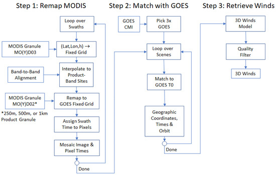 Creation of a 3D-winds dataset is a three-step process. Step 1 remaps a moderate resolution imaging spectroradiometer (MODIS) L1b granule into the fixed-grid projection of the advanced baseline imager (ABI). Step 2 matches features common to a triplet of GOES cloud and moisture imagery (CMI) or radiances and the remapped MODIS granule to measure disparities between apparent geographical positions, which are affected by both atmospheric motion and parallax. Step 3 interprets the observed disparities as atmospheric motion vectors (AMVs) with vertical height assignments.