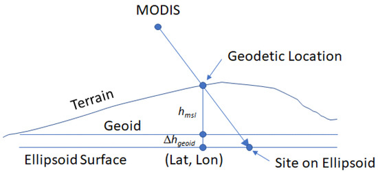 MODIS pixel geographic coordinates represent the geodetic location where the line-of-sight pierces the terrain surface. We recalculate the geographic coordinates to represent where the line-of-sight pierces the WGS-84 ellipsoid considering the terrain height above the geoid (i.e., mean sea level) and the height of the geoid above the ellipsoid (gravity model).