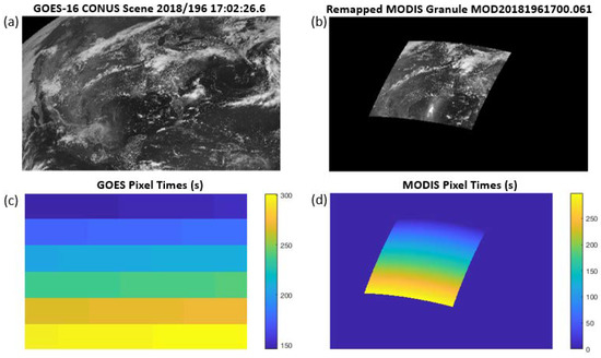 MODIS radiances are remapped along with their time tags to form fixed-grid mosaics in the same geometry as GOES ABI. An ABI scan model provides the time tags for the ABI pixels in each scene. At the upper left (a) is the B02 GOES-16 cloud and moisture imagery (CMI) for the CONUS scene and at the upper right (b) is the matching MODIS granule remapped to the ABI fixed grid. Their respective time models are shown on the bottom row (c,d). A common time epoch is used, which is the time of the first center-of-scan in the MODIS granule (about one second after the granule’s product time in this case). The case shown is MODIS granule MOD2018196.1700.061 (MODIS Band 1) paired with GOES-16 CONUS ABI Band 2.