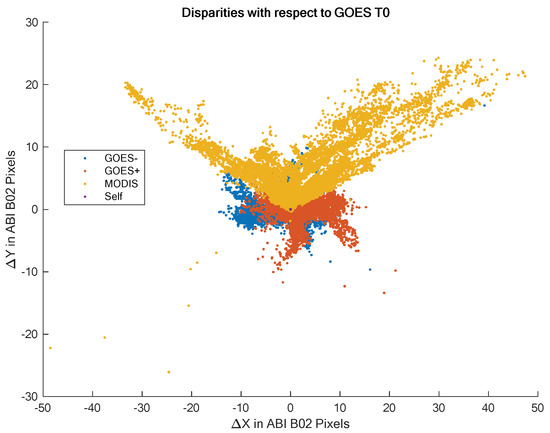 Disparities between matched features in GOES ABI scene T0 and the other images measure a combination of motion and parallax. Disparities are measured along the fixed grid axes (+X − east, +Y − north) in units of ABI B02 pixels. The legend identifies the match from GOES ABI T0 to T0 − Δt (“GOES−”), T0 + Δt (“GOES+”), MODIS, and to itself (“Self”). The characteristic wing pattern seen in the MODIS disparities with respect to the central image of the GOES triplet is due to the large MODIS scan angle at either end of its swath. The self matches (or autocorrelations) are tightly clustered at the origin. The case shown is MODIS granule MOD2018196.1700.061 (MODIS Band 1) paired with GOES-16 CONUS ABI Band 2.