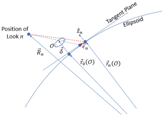 The last step is the interpretation of the disparities as 3D-winds model states. Each template site is assigned a three-dimensional vector , represented in Figure 5, to lift it off the template’s assigned place on the WGS-84 ellipsoid as a function of time relative to the assigned time tag for the template. The initial vector displacement plus the two components of the horizontal wind field are the five model states per site. The model requires satellite position vectors for Terra or Aqua and the GOES satellite. The former is included in the MODIS geolocation data granule from which we interpolate to the time assigned to the template and the latter is taken from a GOES satellite mission-life ephemeris (courtesy of Marco A. Concha and the NASA GOES-R Program). The model used is identical to the MISR-GOES 3D-winds model without bundle adjustment that is fully derived in the Appendix of Carr, Wu, Kelly, and Gong [9]. It can also be used for GEO–GEO and LEO–LEO 3D-winds and is therefore a generic multi-satellite model.