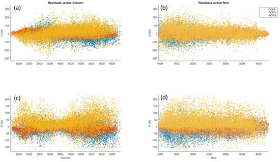 Residual disparities after applying the 3D-winds retrieval model in the tangent plane are plotted by image column in (a,c) or row in (b,d). The legend identifies the matches used in the retrievals: i.e., from GOES ABI T0 to T0 − Δt (“GOES−”), T0 + Δt (“GOES+”), and MODIS. Residuals are less than 0.5 ABI B02 pixel, which is 500 m at the subsatellite point. The case shown is MODIS granule MOD2018196.1700.061 (MODIS Band 1) paired with GOES-16 CONUS ABI Band 2.
