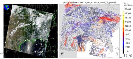 We shall use the term “3D-winds” in this paper to generically describe our stereo methods since a wind vector is solved for simultaneously with its three-dimensional (3D) position within the air column. This is not to be confused with the sense of the term in wind profiling, which resolves the motion of air parcels at multiple heights along a single column of atmosphere. Stereo methods enable a single wind to be retrieved along with its 3D position for each sight line but has the advantage of being able to cover large swaths using a single pair of platforms. Our previous study has shown that joint AMV retrievals using stereo observations from two platforms can significantly improve the quality of AMV wind and height measurements [9]. This study featured the multi-angle imaging capability of the multi-angle imaging spectro–radiometer (MISR), which can provide stereo-height determinations from a single platform. Although MISR’s nine angular views can independently determine the height and the cross-track component of wind, the along-track wind and height are coupled and difficult to separate accurately. By adding GOES-16 ABI imagery, we demonstrated that the joint AMV retrievals uncouple the along-track wind and height to enable improved wind and height products.
