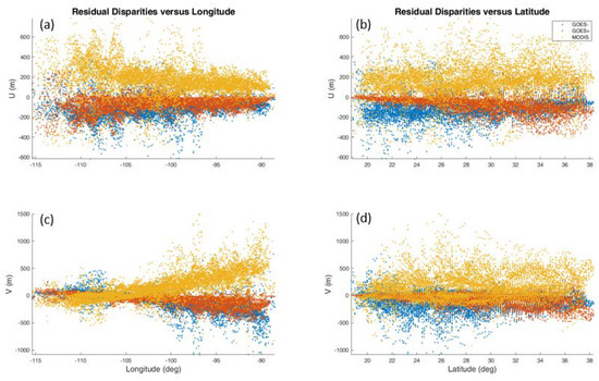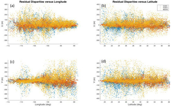 Residual disparities in the tangent plane after retrievals without correcting for band-to-band registration (BBR) offsets (versus longitude (a,c) and latitude (b,d)). The case shown is MODIS granule MYD2019057.2000.061 (Band 31) paired with GOES-16 CONUS ABI band 14.