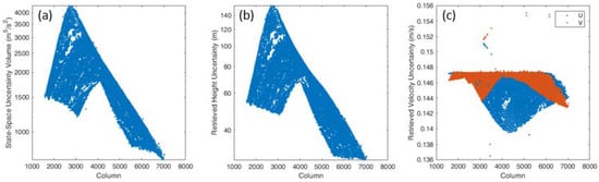 The state-space uncertainty volume (a) and state standard errors (b,c) are estimated from the covariance matrix from the retrieval performed at each site. The case shown is MODIS granule MOD2018196.1700.061 (MODIS Band 1) paired with GOES-16 CONUS ABI Band 2. Some out-of-family covariances are calculated when the retrieved parallax corrections to site locations place a retrieved site at an inappropriate location. These retrievals are generally filtered out in later quality screening.