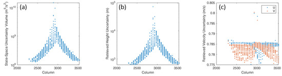 The state-space uncertainty volume (a) and state standard errors (b,c) depend on the geometry of the LEO satellite with respect to the GEO satellite. The state-space uncertainty volume and standard error for the retrieved height become infinite in the singular geometry. The case shown is MOD2019057.1510.061 (MODIS Band 31) paired with GOES-16 Full Disk Band 14. The height uncertainties are larger than those with MODIS Band 1 paired with ABI Band 2 to begin with due to the larger pixel footprint of the IR channels (four times larger in comparison to the finest resolution) and asymptotically approach infinity as the singular geometry is approached. The longer refresh time for a Full Disk scene compared to a CONUS scene will reduce the velocity uncertainties; but real-world features can change shape over longer periods of time, which is an error not represented here.