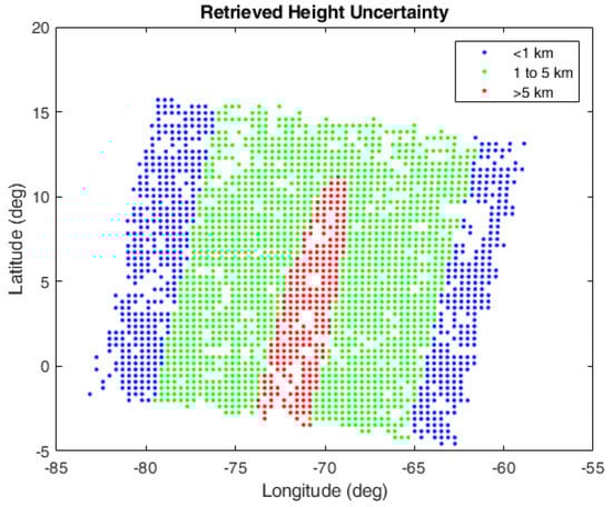 Less favorable geometries will exhibit larger error estimates and there exists a singular geometry where the line of sight for MODIS will be exactly parallel with that of ABI and the covariance matrix will have at least one infinite eigenvalue in the singular geometry, expressing the fact that height cannot be retrieved from parallax in this configuration. This will generally occur when MODIS crosses the equator near the subsatellite point for the GOES satellite, which can occur in a Full Disk scene. In the neighborhood of the singular geometry, the uncertainty for the retrieved height will be large and the retrieved height will be subject to large errors. Figure 11 shows the uncertainties when MODIS passes over Ecuador, which is near the GOES-16 subsatellite point. The height uncertainty suffers the most. We can use the standard error estimates to determine the quality of the retrieval and those with standard error on the height assignment greater than 1 km should not be trusted. Figure 12 shows the geographic distribution of height uncertainties for this case.
