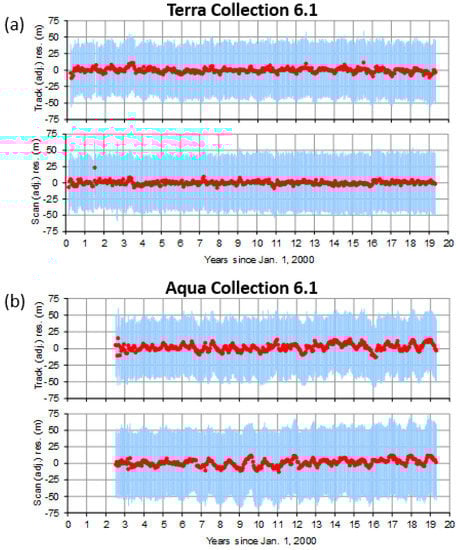 The MODIS instruments on the Terra and Aqua platforms were launched in 1999 and 2002, respectively. Their radiometric L1B and geolocation data products have gone through a few rounds of improvements through reprocessing for each new collection. L1 data products are available now in Collection 6.1. Geolocation errors are detected through ground control point matching and time-dependent biases are corrected [16]. Currently, the mission-wise geolocation biases are within 5 meters and root-mean-square errors (RMSEs) are within 55 meters in both the along-track direction and along-scan directions [17]. These geolocation accuracy values are for MODIS Band 1. Figure 13 shows time series of the measured geolocation errors across the entire Collection 6.1 for both satellites. For other bands, there are band-to-band registration offsets as shown in Table 2 in this paper that are applied to achieve similar accuracy. MODIS observations are expected to last into middle of the next decade, or around 2025, before Terra and Aqua are finally retired.