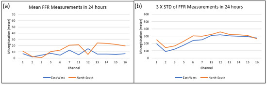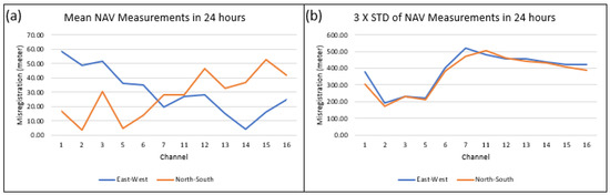 The mean (a) and three times standard deviation (b) of frame-to-frame error of a 24-hour period (June 1st 18:00 UTC to June 2nd 17:59 UTC 2019) for GOES-16. The misregistration is converted to nadir equivalent distance from the angular space of the fixed grid projection.