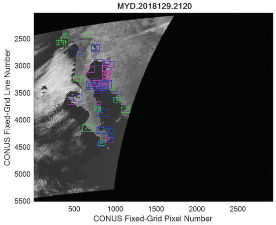 The IPATS technology can also be used to validate the geometric accuracy of the MODIS granules after they have been remapped into the GOES fixed-grid projection, verifying both the quality of the navigation of the MODIS pixels and the correctness of the remapping process. Any residual systematic errors can be measured by matching with Landsat 8 chips, exactly as just described. Any systematic residual error that can be measured can also be compensated by making an adjustment to the remapping and redoing it. Figure 16 shows an example of a remapped Aqua granule with the outlines of the Landsat 8 chips used in the verification. The error statistics of good quality matches (peak correlation coefficient >0.9) in this case are means of −0.06 pixels (EW) and −0.03 pixels (NS), and standard deviations of 0.09 pixels in both directions. The same statistics for the ABI B02 CONUS scene most simultaneous with this granule are means of −0.14 pixels (EW) and −0.03 pixels (NS), and standard deviations of 0.06 pixels in both directions.