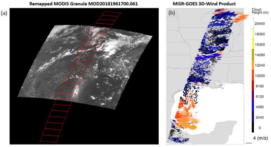 A MODIS granule that has been remapped into the GOES ABI fixed-grid projection is overlaid with red boxes at the left (a) showing the blocks in the MISR path intersecting the granule. The MISR-GOES 3D-wind product is shown at the right (b). The MODIS granule is MOD2018196.1700.061 (MODIS Band 1) and is simultaneous with MISR Path 24, Orbit 98797. (Note: retrieval sites are thinned 4:1 in each direction for clarity).