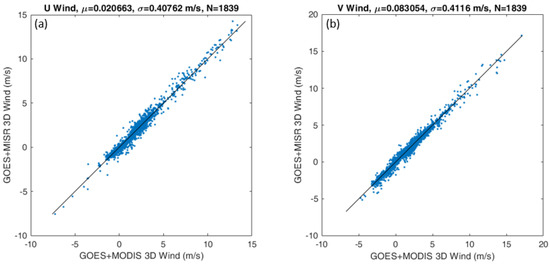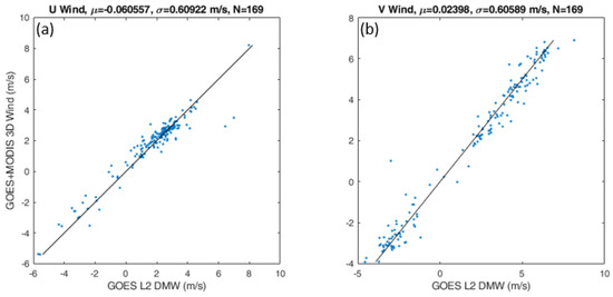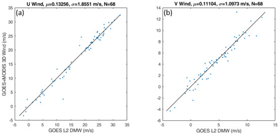Retrieved MODIS-GOES winds are compared with the NOAA operational derived motion wind (DMW) product along the U axis (a) and V axis (b). The diagonal line is the perfect match, and the statistics are computed over the retrieval differences (mean μ and standard deviation σ, over sample size N). The MODIS granule is MOD2018196.1700.061 and the DMW product is for ABI band 2 and the CONUS scene with product time 2018/196 17:02.