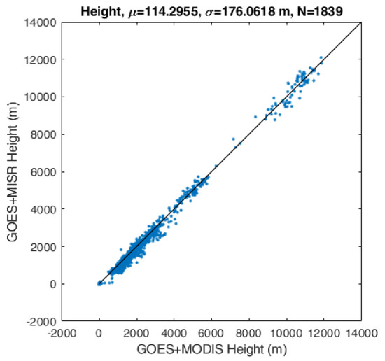 In summary, we compare MODIS-GOES retrievals to simultaneous collocated MISR-GOES retrievals using the same 3D-winds retrieval algorithm. In our previous work [9], we compared MISR-GOES retrievals to NOAA operational DMWs and extensively analyzed ground-point retrievals to validate the application of the new algorithm with MISR and GOES datasets. We concluded that MISR-GOES retrieval height errors were <200 m and AMV errors <0.5 m/s. The MODIS-GOES to MISR-GOES comparison above (Figure 18 and Figure 19) shows an agreement to within these error bounds. Our previous work also compared the MISR-GOES retrievals to NOAA operational DMWs that use IR methods for height assignments. The two often differed by ~1 km. Therefore, we expect that both the MISR-GOES and MODIS-GOES retrievals (except near the singular geometry) should improve the state of the art in AMV height assignments if not necessarily the AMVs alone. However, since wind speed can vary significantly with altitude, a better height assignment can also mean better correlation between the AMV and the in situ wind. Ground-point retrievals are another powerful method for validation. The results presented above (Figure 22) are consistent with those from the MODIS-GOES to MISR-GOES comparison. The processing of a ground pattern is identical to that of a cloud pattern and a range of heights can be sampled according to the natural variation of the terrain. The fact that ground points are static could be a limitation, but comparisons with other AMV products seems perfectly adequate to validate retrieved AMVs alone. The true height assignment for an AMV is, of course, more nuanced as a tracked pattern is not necessarily confined to a single plane. Using the same pattern used for AMV determination to measure directly the pattern height through parallax is a more direct method of assigning a height than IR methods, but certainly additional validations using in situ wind measurements would be beneficial to quantify the relative benefits of the new methods.