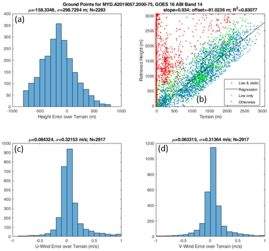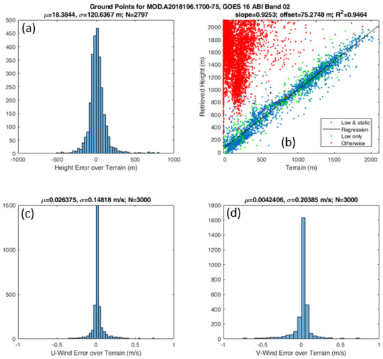 Clear-sky ground retrievals from the MODIS-GOES 3D-winds show the accuracies of retrieved heights (a) and velocities (c,d). The mean μ and standard deviation σ over sample size N are computed for each histogram and the regression parameters (b) for retrieved height versus terrain height are reported for the ground-point class (“Low and static”). The MODIS granule is MOD2018196.1700.061 (MODIS band 1).