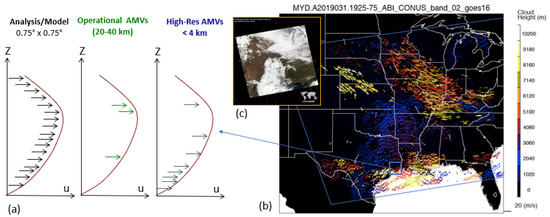 (a) Illustration of the improvement from high-resolution (<4 km) AMVs in representing a quasi-3D synoptic flow. Compared to conventional AMV retrievals at a coarser resolution, the high-resolution algorithm provides more vertical levels of AMVs that can be assimilated in the NWP system. (b) AMVs at 2 km horizontal resolution from the MODIS-GOES retrieval on January 31, 2019 when a cold Arctic system dipped down to CONUS and created severe winter storms in most of the northern states (c). The height of wind vectors is color coded and shows a range of AMV heights from the surface to ~11 km. The blue lines indicate the borders of MODIS image granule in this case (as shown in the embedded image).