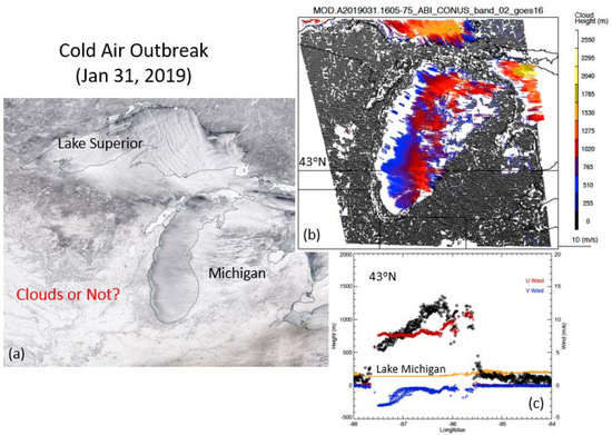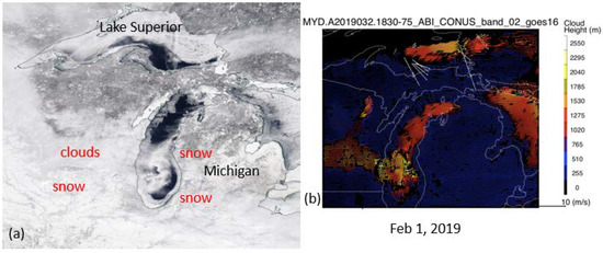 The direction of PBL AMVs can change in a short period of time. On February 1, 2019, the PBL AMVs veered northward in a narrow band over Lake Michigan (Figure 27). There was a less variation in the AMV height, as compared to the January 31, 2019 situation. Clouds and snowy/icy surfaces cannot be readily classified in the MODIS visible image but can with the stereo height map. It is evident that lake ice had grown along the shore during January 28–February 1, as the cold air froze more lake surface. The open water area plays an important role in forming the PBL clouds. In a recent study [25], we found using MISR that the PBL cloud amount increased significantly over the Arctic Ocean as a result of there being more open water from the summertime warming.