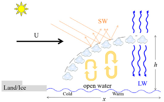 On January 31, 2019, most of Lake Superior and Lake Michigan still had open water except near the shore where lake ice might have formed. The rising PBL top is readily seen in the AMV height retrievals, with the colored wind vectors in Figure 25 showing that the PBL height increases steadily from ~400 m on the western shore to ~1100 m on the eastern shore of Lake Michigan. The CAO event over Lake Michigan was dominated by the zonal wind, which was approximately constant at ~8 m/s for these PBL heights. The rise in PBL height is caused by growth of a stably stratified boundary layer, downstream from the land/ice edge, which progresses slowly by advection of continental air over the water (Figure 26). As detailed by Garratt [24], the depth of the PBL layer is a function of distance and wind speed. PBL clouds from CAO events have an important implication for Earth’s weather and climate systems, because they can cause heavy snowfall and modulate shortwave (SW) solar radiation.