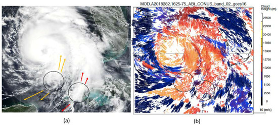 (a) MODIS image of Hurricane Michael on October 9, 2018 with the circles indicating deep convective zones and the arrows for wind direction. (b) Retrieved AMVs from ABI band 2 with height in color. The circles highlight small AMV wind speeds at high altitudes.
