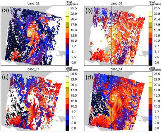Distributions of the AMV height retrieval (chip size 32 × 32 km) for the four spectral bands (ABI bands 2, 4, 7, and 14 in panels (a–d) respectively). The vertical line is 87.5° W longitude.