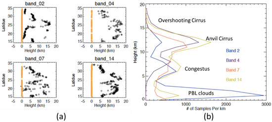 (a) Stereo height retrievals along 87.5° W longitude for the four spectral bands. The surface height is in orange. (b) Vertical distributions of the AMV stereo heights derived from the four spectral bands for the entire granule. All height retrievals are from chip size 32 × 32 km.