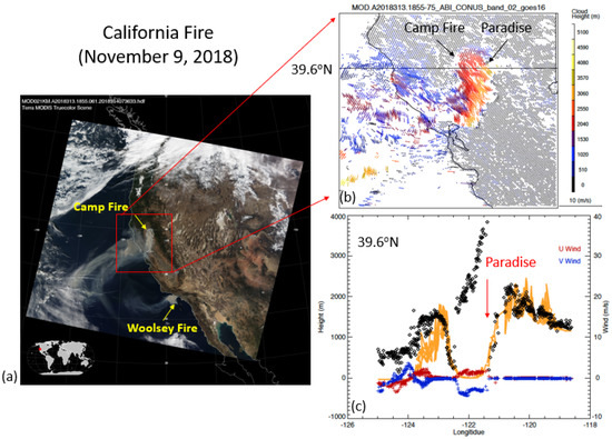 (a) California camp fire and Woolsey fire as seen by Aqua/MODIS on November 9th. (b) The MODIS-GOES AMV and height retrievals over the northern California, and the cross-section (c) at a latitude of 39.6° N. The AMV vectors in the map are colored by their height above terrain. In the 39.6° N cross section, the terrain height is in orange whereas the 3D-wind stereo height is in black.