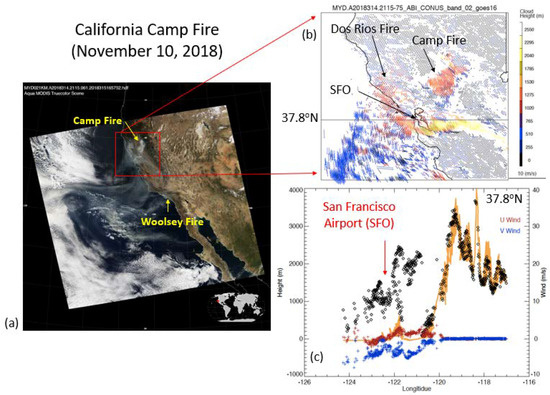 Figure 32 shows a scene of the northern California wildfires at 21:15 UTC on November 10th where Aqua/MODIS and GOES-16 made a joint stereo retrieval of the AMV and height from the fire plumes. At this time, the wildfire near Dos Rios was more than 50% contained, but the Camp fire continued to spread its damage. As seen in the MODIS image, the plumes from the Camp Fire were dense with heights topped at 1–1.5 km above the surface. The plumes near the fire sources are slightly higher than those in the downstream, with a northwesterly wind speed of ~5 m/s. By combining the stereo height and wind measurements with MODIS fire intensity data, 3D-wind products can help to improve the wildfire emission and dispersion models used for public health and air quality prediction [28].