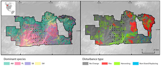 Location and outline of the study area. Black dots indicate sample plot locations. Dominant species codes: AW: Trembling aspen; PL: Lodgepole pine; SB: Black spruce; SW: White spruce.