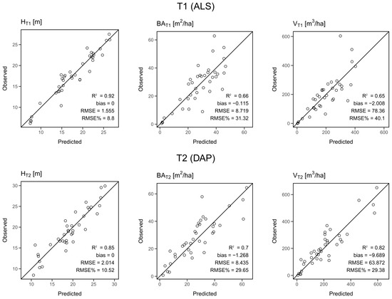 Observed vs predicted values for the three modeled stand attributes: Top height (H), basal area (BA), and total volume (V). Stand attributes modeled using airborne laser scanning (ALS) data at Time 1 (T1) and digital aerial photogrammetry (DAP) data at Time 2 (T2).