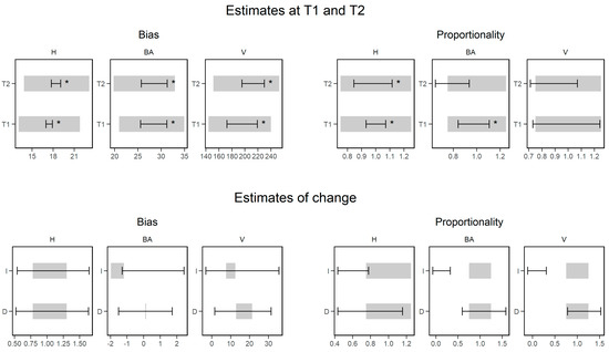 Results of bootstrapped equivalence tests for stand attributes modeled at T1 and T2 (top) and change estimated with the indirect (I) and direct (D) approach (bottom). In each case, the equivalence test is performed for bias and for proportionality. The grey rectangle indicates the region of equivalence, while the black crossbar depicts the 95% confidence interval. An asterisk indicates cases when the test is satisfied (i.e., confidence interval within the region of equivalence).