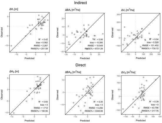 Scatterplots of the observed versus predicted values for change in top height (H), basal area (BA), and volume (V) using the indirect and direct approaches.