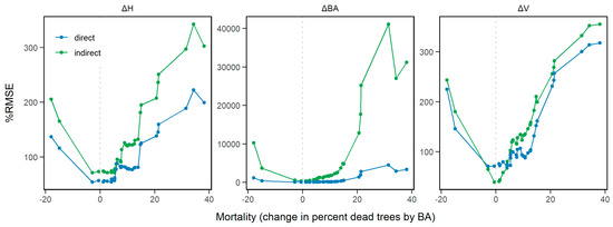 To observe the impact of tree mortality on the model predictions, we analyzed how the RMSE% changes with different levels of stand-level mortality. To do that, we developed indirect and direct models for ∆H, ∆BA, and ∆V iteratively, using a subset of plots for each iteration. The number of plots increased at each iteration, and by ordering the plots by the level of mortality, the accuracy of each model could be related to the level of plot mortality. At each iteration, predictions and RMSEs were generated from the separate T1 and T2 models (indirect approach) and from a single model for the direct approach.