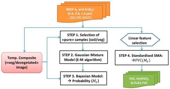where V(r) denotes the error matrix of the observations r. The coarse spatial resolution of SEVIRI and the availability of only three spectral bands poses a significant challenge for endmember selection in traditional (deterministic) SMM. The FVC algorithm relies on a novel stochastic SMM which uses a statistical representation of the endmembers to accommodate their variability at a global scale. Each pixel is described by a multiple combination of two pure classes, the target (vegetation) and the background (soil). Both vegetation and soil classes are not treated as deterministic (i.e., using fixed endmembers) but they follow a statistical (multi-modal) distribution, which attempts to capture the variability of soils and vegetation components at a global scale. The main steps of the algorithm are now described (see Figure 2).