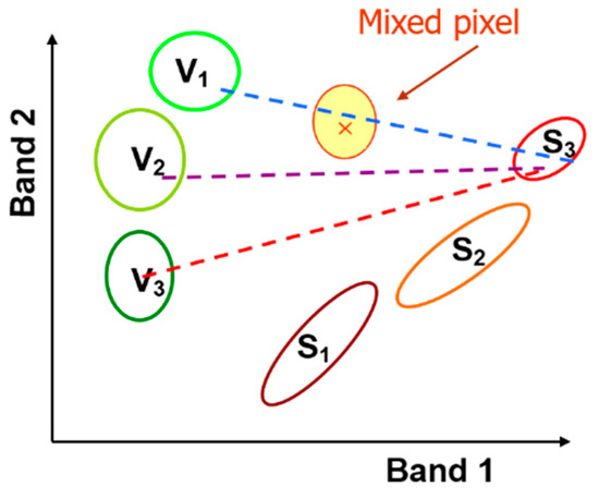 The algorithm solves this integral using Monte Carlo methods, i.e., from endmember spectra drawn from multivariate normal distribution. It basically consists in counting the number of model samples from each possible mixture combination that can give rise to the mixture pixel r, as illustrated in Figure 3 considering a simplified bidimensional problem with 3 vegetation clusters (V1, V2, V3) and 3 soil clusters (S1, S2, S3). The size and orientation in the elliptical probability density contours are determined by the covariance of clusters . It is obvious that (S3, V1) is the most likely model in the mixture. However, other different model combinations, such as (S2, V1) and (S3, V2), have non negligible probabilities and may yield to the same mixture spectrum.