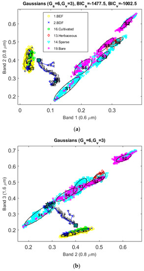 Illustration of the probabilistic mixing model concept over in the k0 space of SEVIRI channels: (a) channel 1 and 2; (b) channel 2 and 3. Elliptical probability density contours associated with clusters (from V1 to V3 for vegetation and from S1 to S6 for soil). BDF and BEF correspond to broadleaved deciduous and broadleaved evergreen forest, respectively. BICs and BICv refer to the values of BIC for the soil and vegetation mixture models, respectively.