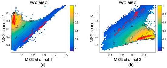 Figure 5 allows understanding better the physical basis of the algorithm and its performance. The results correspond to mean predictions of FVC given a realized value of two SEVIRI channels (considering all possible values of the third channel). We can identify the triangle envelope formed by the mixed pixels which is the physical basis for SMM approaches. The soil/vegetation components are spectrally distinct enough, particularly in the red-NIR space (Figure 5a), where non-vegetation surfaces distribute primarily along the so-called “soil line”. Dense canopies situate in the top vertex, although showing a significant spectral variability. The LSA SAF algorithm provides a fair generalization of information from the training data generated in step 1, suggesting that solutions are well constrained. The isolines present realistic values that are consistent with other literature studies [46], and EPS satellite products [24]. The smooth FVC variations with gradual change in reflectance suggests that solutions are stable, without discontinuities that lead to large retrieval errors and are usually found in SMM problems with a large number of endmembers. The algorithm mitigates thus the effects of noise in the input data.
