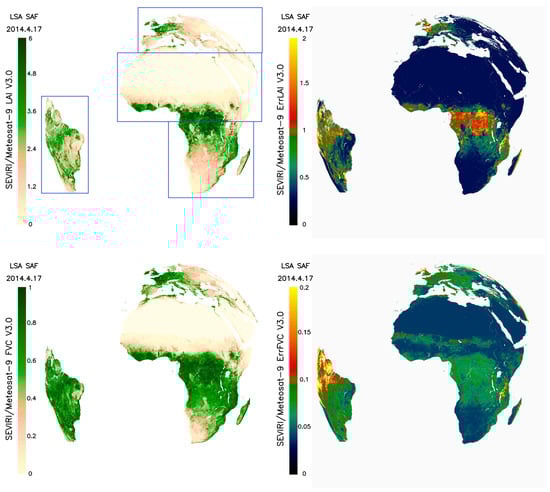 MSG Daily LAI (top), FVC (middle) and FAPAR (bottom) LSA SAF product composition corresponding to the 17th of April 2014 products (left panels) and their respective error estimates (right panels). Location of the four LSA SAF geographical areas is also provided. Rectangles in the LAI field are associated to Euro, NAfr, SAfr and Same SEVIRI geographical regions for illustrating purposes.