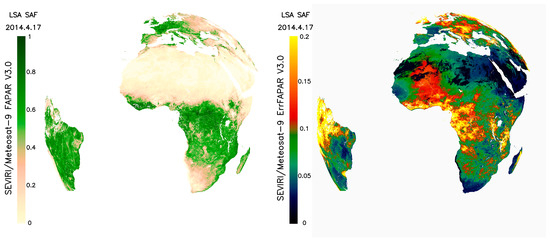 The LSA SAF generates and disseminates a suite of vegetation products derived from SEVIRI/MSG BRDF composited data for the whole Meteosat disk over land surfaces ideally free of snow and ice cover using the described algorithm at two different time resolutions (see Figure 6), daily (MDLAI, MDFVC, MDFAPAR), and 10-days (MTLAI, MTFVC, MTFAPAR) [54]. The characteristics of SEVIRI based products provided by the LSA SAF are described in Table 1. Daily products use as input the MDAL BRDF parameters computed using a daily rolling compositing approach with a characteristic 5-day compositing period, whereas the 10-days product use as input the MTAL BRDF product based on a composite over a 30-day period. We refer for further details about the recursive temporal composition to Geiger et al. [33]. Using the latest version of the daily (v3.1) and 10-days (v1.2) algorithms, released in January 2016, the LSA SAF system generates and disseminated the products in Near-Real-Time (NRT) with a time lag of about six hours. NRT users are also encouraged to use EUMETCast (https://navigator.eumetsat.int), i.e., the primary distribution means for EUMETSAT image data and derived products.
