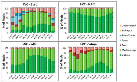 The seasonal variations in the quality and coverage of the daily MSG FVC product along 2014 are depicted in Figure 8. Optimal or medium quality retrievals are obtained for north and south Africa continental zones with a negligible percentage of poor quality or missing values. An acceptable performance is also found over Europe from April through September, with a significant quality reduction during late autumn and winter. The worst performance is observed for south America regions, generally due to decreased accuracy and a larger percentage of missing values. Both daily MSG LAI and FAPAR products show similar performance stages with slightly lower rates of high quality values.