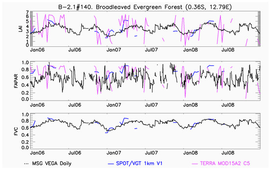- Camacho, F.; García-Haro, F.J.; Fuster, B.; Sanchez-Zapero, J. MSG/SEVIRI Vegetation Parameters (VEGA) Validation Report. SAF/LAND/UV/VR_VEGA_MSG, v3.1. 2018, p. 109. Available online: https://landsaf.ipma.pt/en/products/vegetation/ (accessed on 9 September 2019).