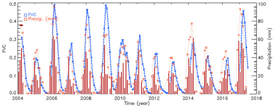 The SEVIRI/MSG vegetation products are routinely used as input in the operational line of several LSA SAF products. Daily MSG FVC and LAI are required inputs to update information about the state of vegetation for the derivation of the LSA SAF evapotranspiration and (latent and sensible) heat flux products [71]. The MSG FVC information on the pixel fraction of vegetation cover is required to operationally retrieve thermal Land Surface Emissivity [72]. The daily MSG FAPAR is also included as input on the Monteith’s LUE concept used for the computation of the 10-days Gross Primary Production (MGPP) product recently developed in LSA SAF [73,74]. The remaining of this section provides further insights about potential use of the LSA SAF vegetation products, considering three illustrative examples of land processes applications.