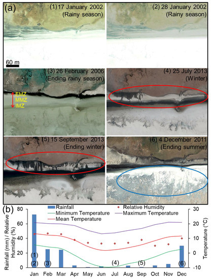 Brine seasonality on the slopes. (a) Available high-resolution images from different seasons. The red ellipses highlight the emergence and growth of brines throughout the winter. The blue ellipse signifies the freshly precipitated salt evaporites. The double-headed red arrow shows various regions of the mixing zone (IMZ: Internal mixing zone, MMZ: Middle mixing zone, and EMZ: External mixing zone). (b) Meteorology of the study area. The plotted meteorological data have been derived from Table 1 of Lamparelli et al. [75]. The numbers on the bar plots represent the corresponding images in (a). The data provider for the GE images in (a) is CNES/Airbus.