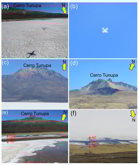 Several of the field photographs that were captured between 22 and 26 August 2017. (a) The unmanned aerial vehicle (UAV) during lift-up. (b) The UAV at the top altitude of 60 m from the surface. (c,d) are pictures of Cerro Tunupa from Location 1 and Location 2, respectively. The double-headed red arrows in (e,f) show various regions of the mixing zone (IMZ: Internal mixing zone, MMZ: Middle mixing zone, and EMZ: External mixing zone). Field photograph credit: Group of Atmospheric Science, Luleå University of Technology.