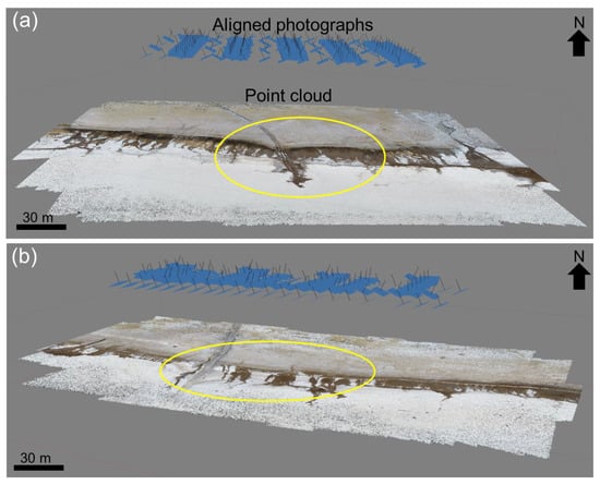 Aligned photographs and dense point clouds for (a) Location 1 and (b) Location 2 for 22 August 2017 surveys that were generated in the Agisoft PhotoScan Pro stand-alone licensed software. The yellow ellipses highlight our areas of interest in the middle, densest portion of the point clouds.