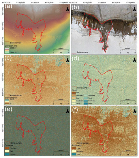 Terrain at Location 2. (a) DEM, (b) orthomosaic, (c) slope, (d) aspect, (e) curvature, and (f) roughness. The numbers and red polygons indicate the brine samples that we selected for further analyses.