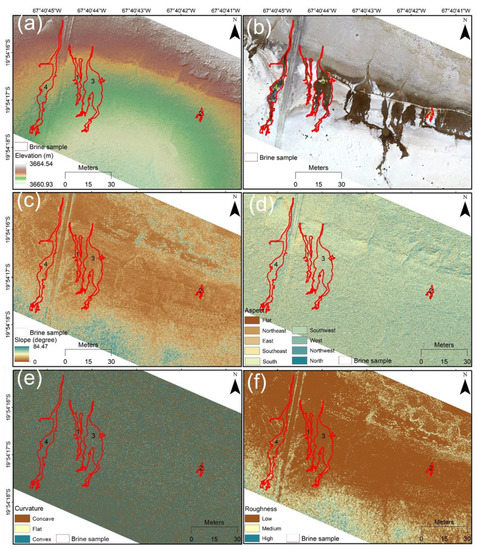 Terrain at Location 1. (a) Digital elevation model (DEM), (b) orthomosaic, (c) slope, (d) aspect, (e) curvature, and (f) roughness. The numbers and red polygons indicate the brine samples that we selected for further analyses.