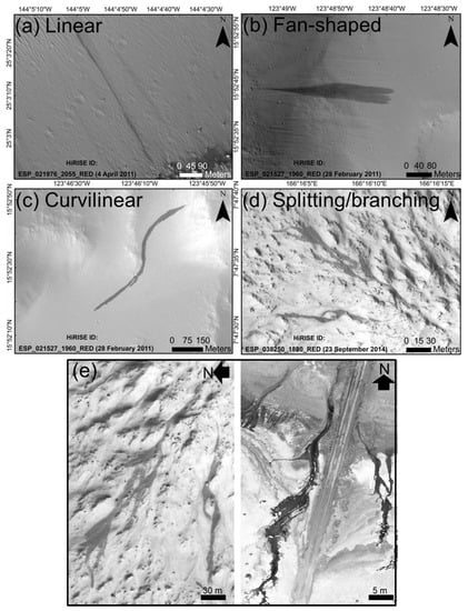 Several of the most common morphologies of Martian slope streaks. (a) Linear, (b) fan-shaped, (c) curvilinear, (d) splitting/branching, and (e) Martian slope streaks (left) and Samples 1 and 4 (right) from Salar de Uyuni (in grayscale for comparison). High Resolution Imaging Science Experiment (HiRISE) image credit: NASA/JPL/University of Arizona.