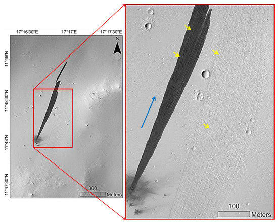 - Chuang, F.C.; Beyer, R.A.; McEwen, A.S.; Thomson, B.J. HiRISE observations of slope streaks on Mars. Geophys. Res. Lett. 2007, 34. [Google Scholar] [CrossRef]