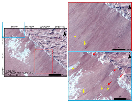 - Chojnacki, M.; McEwen, A.; Dundas, C.; Ojha, L.; Urso, A.; Sutton, S. Geologic context of recurring slope lineae in Melas and Coprates Chasmata, Mars. J. Geophys. Res. Planets 2016, 121, 1204–1231. [Google Scholar] [CrossRef]